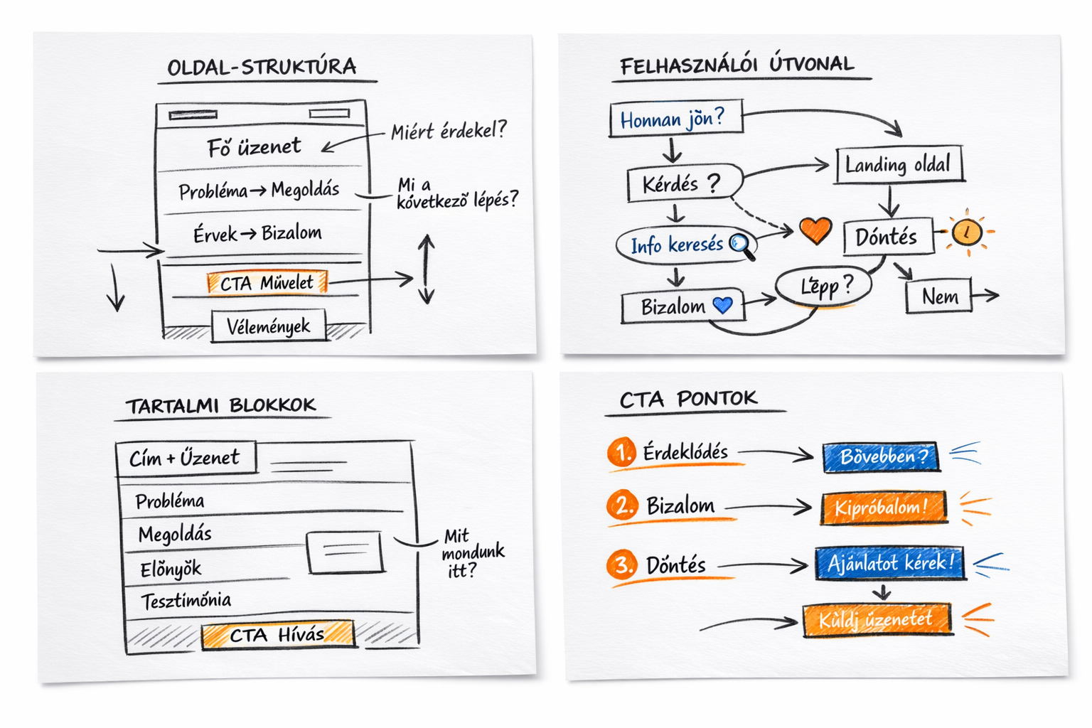 Ez jól hangzik, de a valóságban egy működő, üzletet támogató weboldal nem ilyen lineárisan születik. Inkább olyan, mint egy beszélgetés, ahol először meg kell érteni, miért jöttél, mit szeretnél elérni, és mit kell tennie a látogatónak, miután megérkezett az oldaladra.